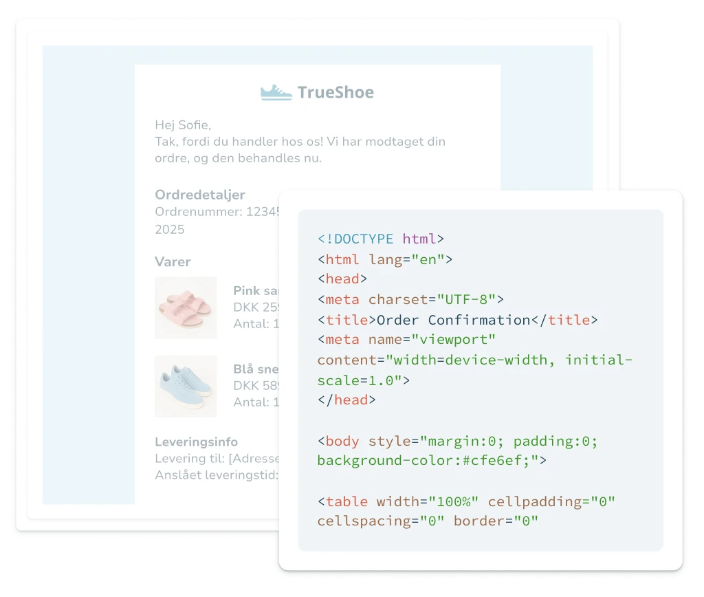 Tilpas dine e-mails og få fuld kontrol over designet, når du har brug for det. Med HTML-funktionen kan du tilføje og redigere eget HTML direkte i e-mail editoren. Funktionen giver dig frihed til at bygge unikke mailskabeloner, tilpasse eksisterende layouts og tilføje specialelementer, der matcher dit brand.